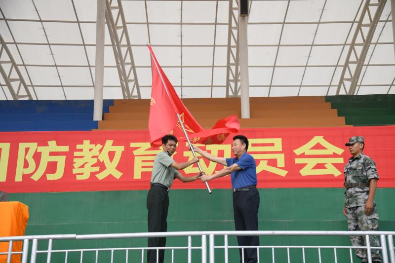 校长张义明教授向军训团授旗。张校长郑重将烈烈飘扬的鲜红军训旗授予军训团代表。