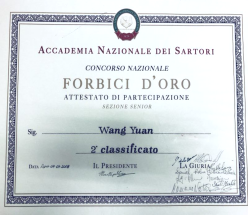 王媛毕业后留在陕服任教。任教以来,她积极钻研业务,虚心向教授和大师们请教,经常得到汤子峰大师的指点。几年下来,她的业务水平、学术水平得到持续提高。2018年是她大丰收的一年,她的技术水平得到广泛认可。那一年她连获国际国内大奖。“中国时装技术奖”、“陕西服装30年优秀设计师”、“陕西服装30年优秀工匠”、微课三等奖。她获得的最重要奖项是2018年7月得到ForbiciD~ORO意大利“金剪刀”裁缝师大赛总决赛第二名,摘取了世界上服装艺术皇冠上的明珠。第一名是她的陕服校友毕锦培。她和毕锦培一起成为中国的骄傲。