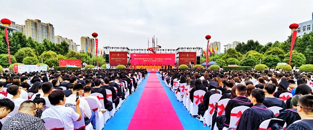 校长张义明教授代表校党政向3836名学生顺利毕业表示祝贺,向为毕业生成长成才付出辛勤努力的教职员工、家长朋友们表示衷心的感谢和诚挚的敬意。今年我校本科毕业生1312人,1287人获得学士学位;820名专科学生通过专升本考试;406名同学加入了中国共产党;280名同学获得国家奖学金;47名同学获得省级优秀毕业生和学生干部称号;本届毕业生在全国大学生各类竞赛中,荣获一等奖14项,二等奖42项,三等奖39项。张校长指出,毕业典礼是毕业生们踏上人生征程、履行社会责任的新起点,也是离别母校时庄严的成人礼。在同学们即将踏上崭新人生旅程之际,他真诚希望同学们始终保持一颗平常心、实现学子梦,以自信坚定的步伐走向社会,永远保持一颗进取心实现人生梦,以一颗责任心助推中国梦,以昂扬向上的姿态迎接未来,以敢于担当的锐气书写人生。