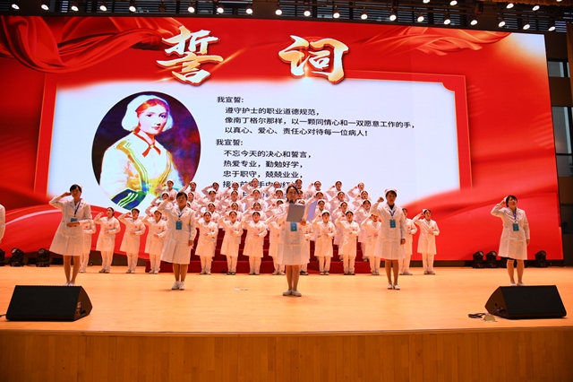 晚会上举行了庄严的新入职护士授帽仪式。授帽仪式是护生成为护士的重要时刻。伴随着庄严乐曲,护生直跪在护理前辈面前,前辈为护生戴上圣洁的燕帽,护生接过前辈手中的蜡烛,站在南丁格尔像前宣读誓言,这也象征着新入职护士正式投身于伟大的护理事业中。