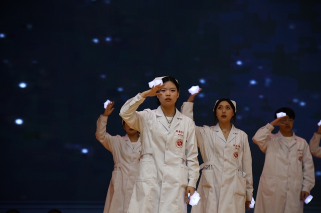 晚会上,健康学院的学生进行了文艺表演,手语操《夜空中最亮的星》、诗歌朗诵《医护·耀初衷》、舞蹈《美人关》,护士礼仪展示等精彩节目引人入胜、发人深省,赢得了阵阵掌声。