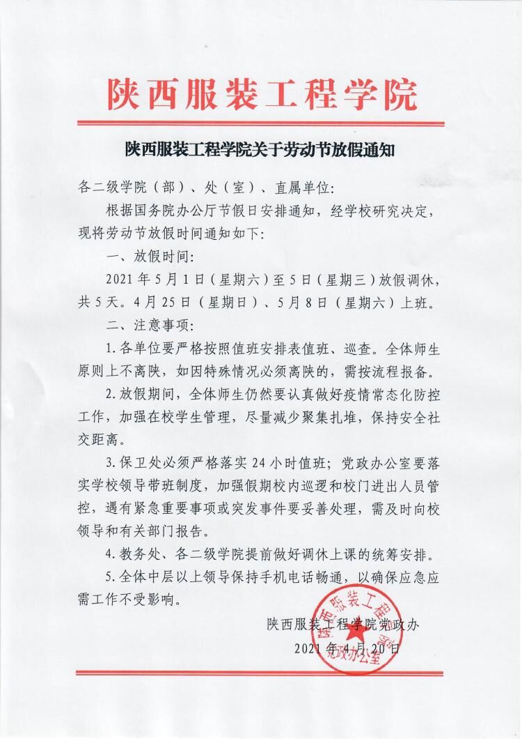 陕西服装工程学院关于劳动节放假通知