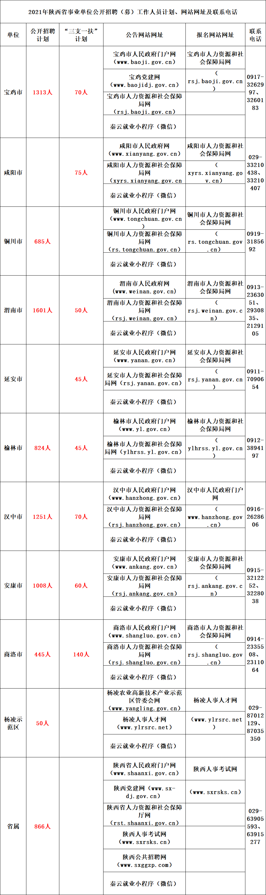 根据《事业单位人事管理条例》《陕西省事业单位公开招聘工作人员实施办法》及相关规定,即日起,陕西省事业单位公开招聘(募)工作人员工作将全面展开。本次事业单位公开招聘(募)工作人员涉及宝鸡、咸阳、铜川、渭南、延安、榆林、汉中、安康、商洛、杨凌示范区和省属事业单位,招聘(募)计划8598名(包括“三支一扶”计划555名)点击获取职位表。此前,西安市已发布公告,公开招聘中小学、幼儿园教师2100名。应聘人员可登陆省市人民政府门户网、人力资源和社会保障厅局网、人事考试网等网站查看相关招聘(募)公告。本次报名采取网络报名和网上资格审查的方式进行。报名时间为2021年3月18日00:00至2021年3月21日24时。省属事业单位报名网站为陕西人事考试网,市区报名网站详见相关公告规定。应聘人员只能报考一个岗位。笔试时间为2021年4月11日上午。笔试科目为《职业能力倾向测验》和《综合应用能力》两科。为做好新冠肺炎疫情防控工作,请应聘人员认真阅读招聘(募)公告内容并严格遵守相关规定。对故意隐瞒病情、不按要求提供核酸检测证明、不如实告知情况的,取消本次考试资格,并按有关法律法规追究相关责任点击获取职位表。为确保本次公开招聘(募)工作公平、公正,严厉打击作弊行为,对公开招聘(募)工作中出现的违纪违规情形,按《事业单位公开招聘违纪违规行为处理规定》给予成绩无效、记入诚信档案等处理;构成犯罪的,依法追究刑事责任点击获取职位表长按识别下方二维码