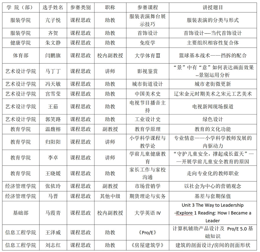 根据教务处4月28日《关于举办陕西服装工程学院2024年“立德杯”课程思政讲课比赛的通知》(陕服教函〔2024〕15号)通知要求,各院(部)采取集中公开赛课方式举行了院级初赛。现将各院(部)推荐参加学校复赛的教师名单公示如下: