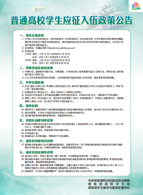 本期就业政策公告为《普通高校学生应征入伍政策公告》,毕业生到基层就业,在公务员、事业单位招录以及考学升学方面均可享受优惠。