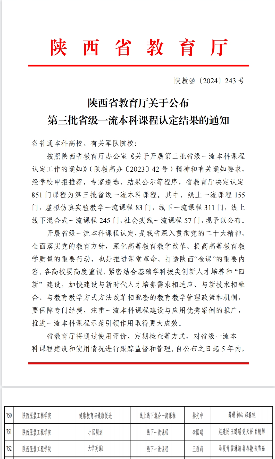 陕服新闻网讯(韩涛)3月5日,陕西省教育厅公布了第三批省级一流本科课程认定结果,我校3门课程获批。其中线下一流本科课程2门,线上线下混合式一流本科课程1门,本次获批的省级一流本科课程数量创我校历史新高。