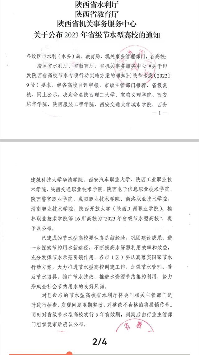 陕服新闻网讯(李文斌)近日,陕西省水利厅、 陕西省教育厅、陕西省机关事务服务中心公布2023年陕西省省级节水型高校评选结果,全省16所高校获得“2023年省级节水型高校”殊荣,我校在列。