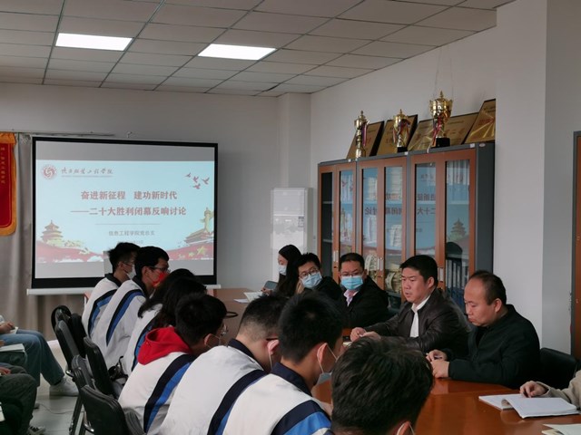 信息工程学院党总支书记、执行院长甘霖:今天上午,党的二十大胜利闭幕。信息工程学院党总支将把学习宣传贯彻党的二十大精神作为当前和今后一段时期的重大政治任务,引导全院党员干部、师生员工迅速把思想和行动统一到党的二十大精神上来,不断增强与党同心、跟党奋斗的政治自觉、思想自觉和行动自觉;聚焦党的二十大提出的重要思想、重要论断、重大举措,有组织地开展系统化、科学化研究阐释,着力在立德树人的具体实践中走前头、作表率;将始终立足管党治党,切实加强党对学院工作的全面领导,持续激发创新创造活力,奋力推动学院事业内涵式、高质量发展,为全面建设社会主义现代化国家、全面推进中华民族伟大复兴做出新的更大贡献。