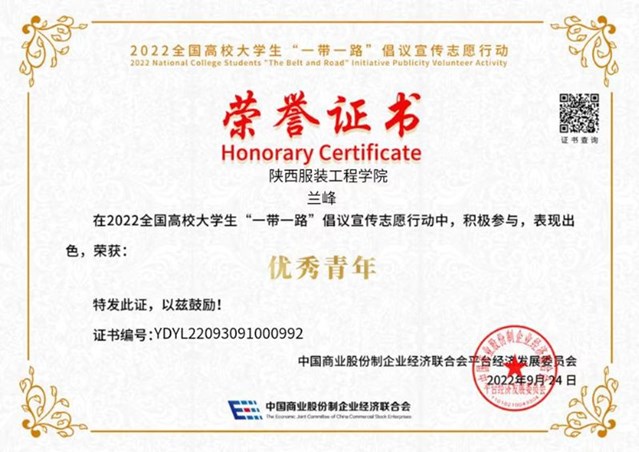 陕服新闻网讯(交通学院)近期,我校交通学院铁道机车车辆制造与维护专业2101班兰峰同学获得2022年全国高校大学生“一带一路” 倡议宣传志愿行动优秀青年称号。城市轨道交通运营管理专业2101班王潘同学在各类活动中5次获奖。先后获得《健康中国杂志》全国大学生“健康中国观察志愿者”荣誉称号;“2022年全国高校大学生海洋保护倡议行动”守护之星荣誉称号;“2022高校节能低碳志愿行动”志愿者荣誉称号;2022年全国高校青年“乡村振兴”志愿活动奋进青年荣誉称号。