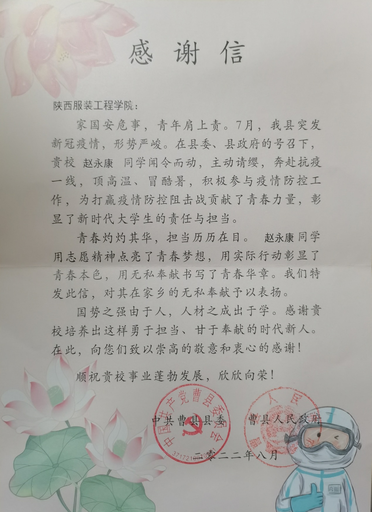 陕服新闻网讯(谢娜娜)近日,我校收到一封来自山东菏泽曹县县委、县政府的感谢信,信中对我校健康学院护理专业2201班的赵永康同学在曹县疫情期间主动请缨,奔赴一线,顶高温、冒酷暑,积极参与疫情防控工作提出表扬和感谢。