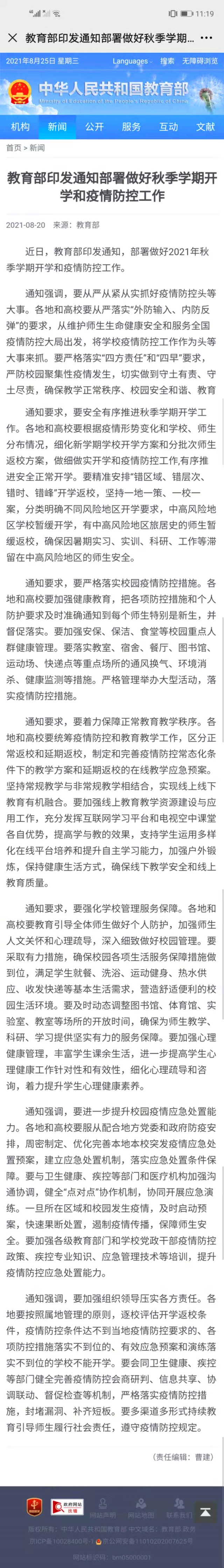 教育部印发通知部署做好秋季学期开学和疫情防控工作