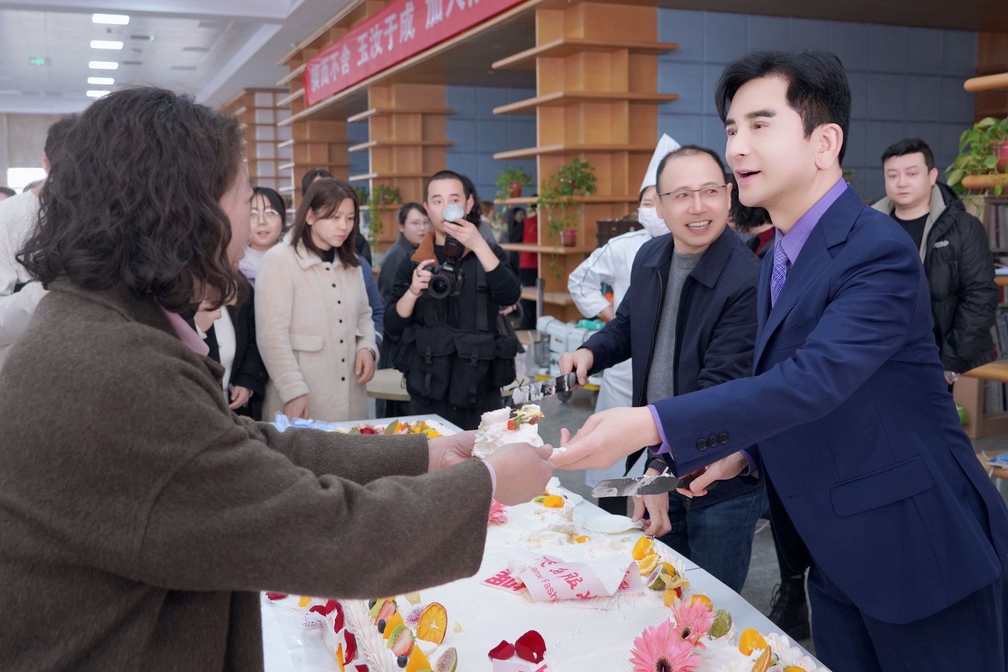 座谈会上,学校为三月份过生日的刘萍、张蓓等六十多名女教职工精心准备了生日蛋糕庆生,吕明董事长为大家切蛋糕、送上节日的鲜花。会场上其乐融融,气氛热烈。