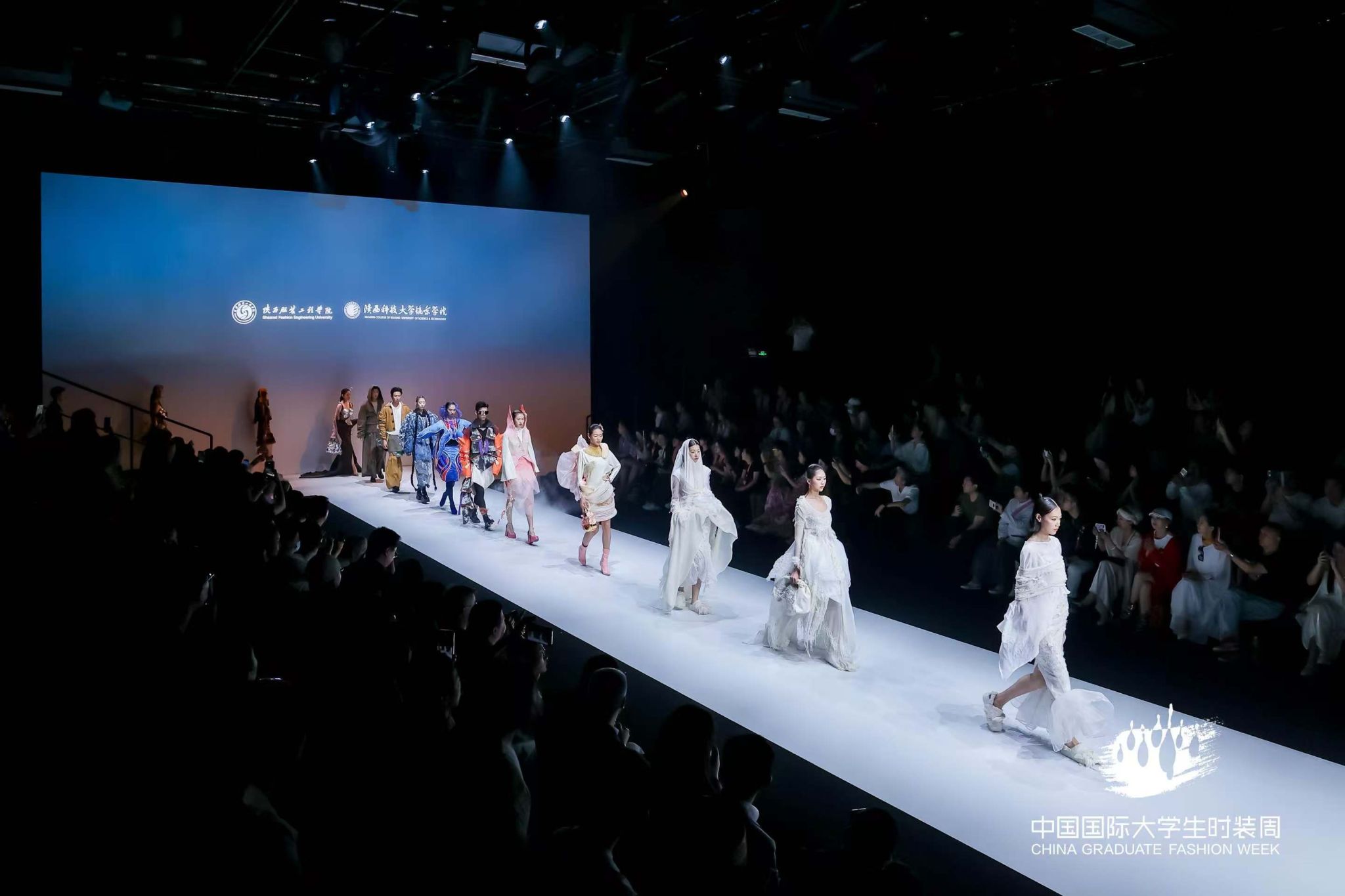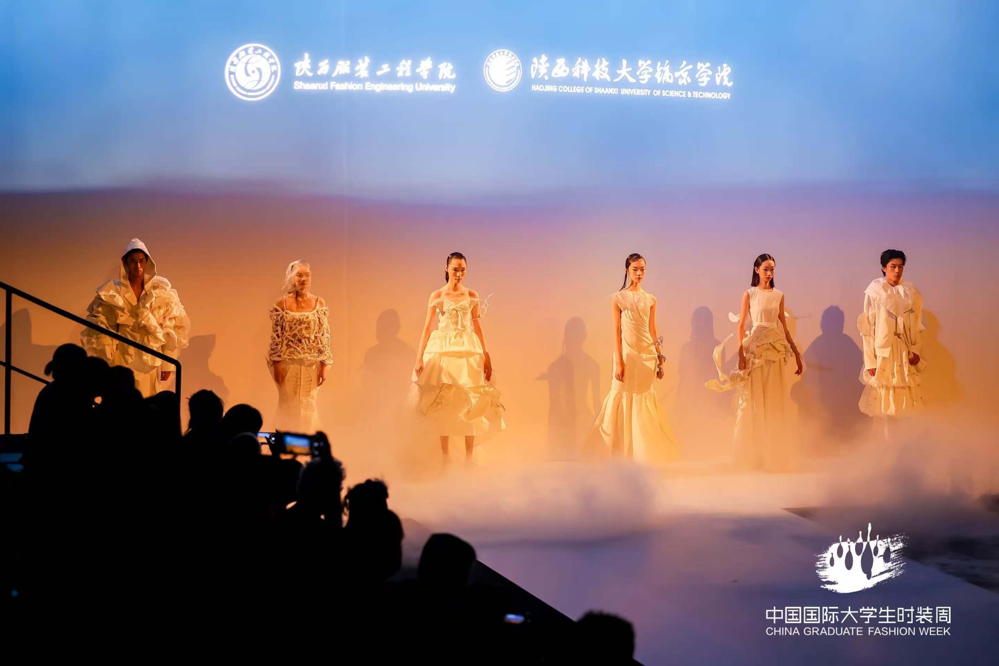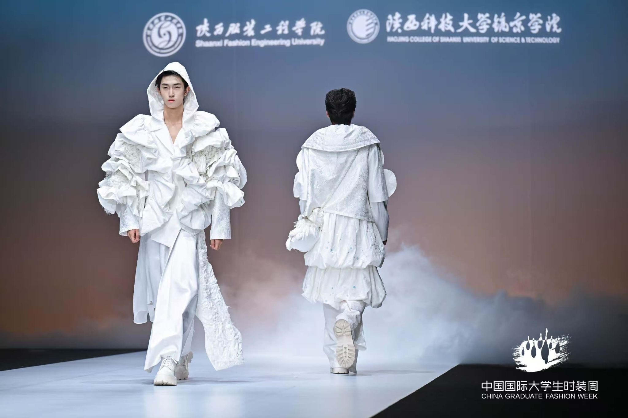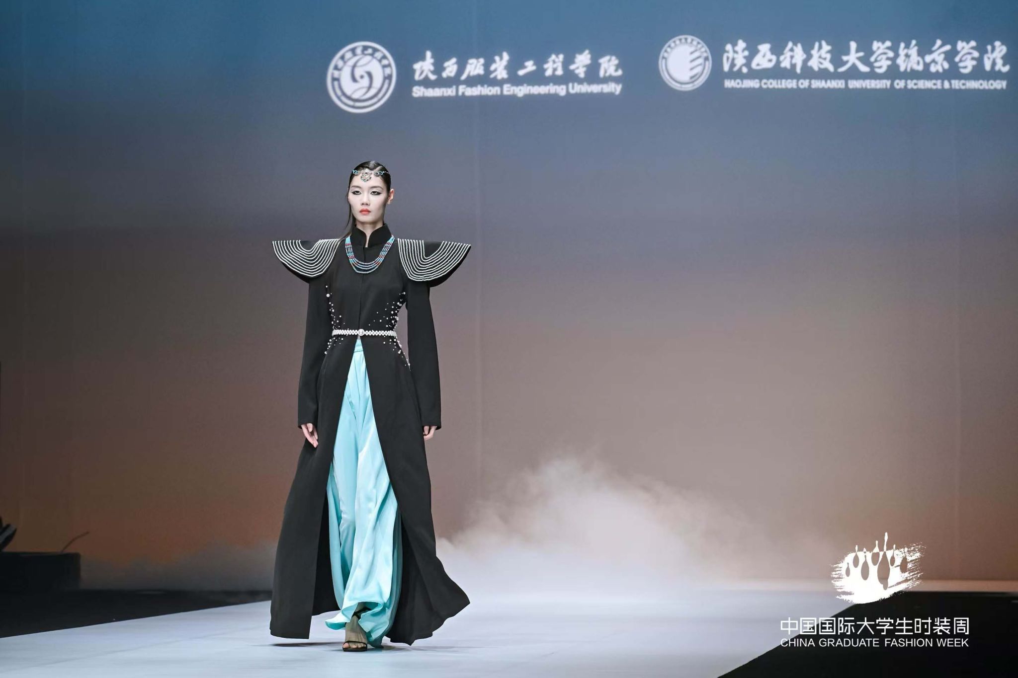 陕服毕业生“丝路·大美山河”主题参展作品,以丝绸之路为灵感源点,“数字与艺术交融,文化与时尚共生”的设计理念,深度挖掘丝路沿线的自然禀赋与人文脉络,用“廓形勾勒地形地貌,纹样诉说历史沧桑”表征中华传统文化的精美。从灵动飘逸的服饰剪裁到独具匠心的图案设计,从传统工艺的创新运用到前沿科技的时尚表达,每一件作品都展现了毕业生作为年轻设计师,对美的独特追求和深厚的艺术造诣,彰显着新时代时尚学子的无限创造力与专业实力,让观众沉浸在一场跨越时空的文化与时尚之旅中,深刻领略到丝路文化的独特魅力与山河之美。服饰之美仿若流转于婉转绵长的层峦叠嶂,每一件作品皆如行走的文化长卷,让千年丝路的壮美山河在T台上徐徐铺展。