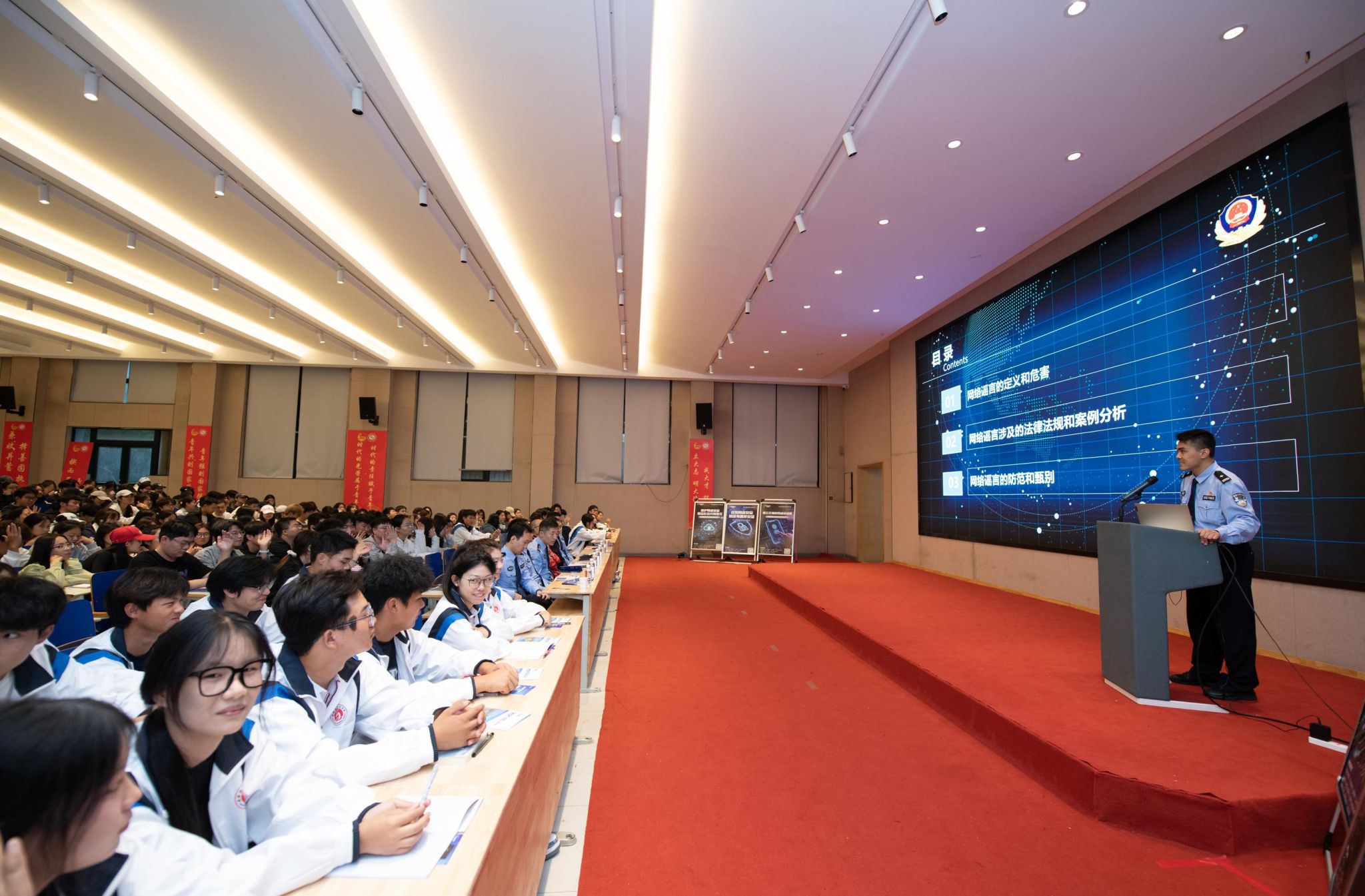 陕服新闻网讯 (信息化处)为强化学生网络信息辨别能力与安全意识,引导大家抵制网络谣言、共创清朗网络空间,9月18日,我校联合西安市公安局西咸新区公安局网安大队在教学楼E1-4报告厅举办了 “打击网络谣言,维护清朗网络” 专题讲座。副校长刘运、党委组织部部长伍建成、西安市公安局西咸新区公安局网安大队大队长杨勃出席会议,各二级学院学生代表聆听讲座。讲座由学校信息化处习冲锋主持。
