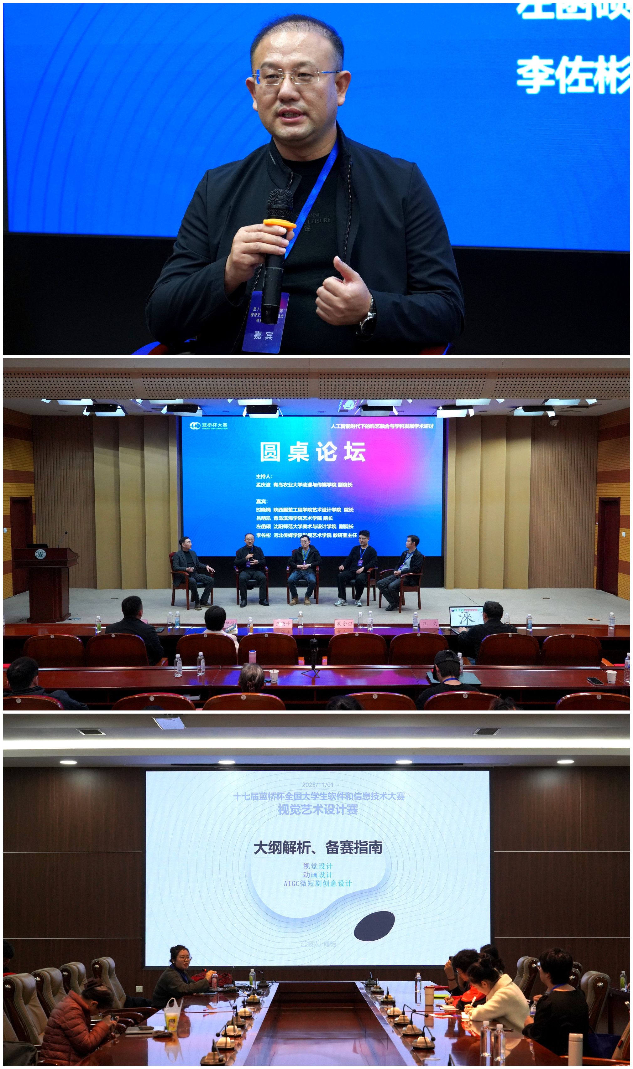 本次会议由蓝桥杯全国大学生软件和信息技术大赛组委会主办,紧扣“科艺融合”与“乡村振兴赋能”两大核心主题,设置第十六届大赛总结表彰、第十七届大赛启动、专家主旨分享、双论坛研讨、赛项解析等多元环节。教育部高等学校动画、数字媒体专业教指委委员王亦飞、严晨,设计学类专业教指委委员王晓予等十余位权威专家,围绕AIGC赋能设计创新、乡村振兴设计实践等前沿议题,为参会者分享了先进理念与实操经验。大赛专家还针对视频设计、动画设计、交互设计(UI)等多个赛项,系统解读竞赛规则、深度剖析历届优秀作品,并分享实战辅导经验,同步组织全体与会人员参观青岛农业大学艺术学院工作室,强化实践交流。