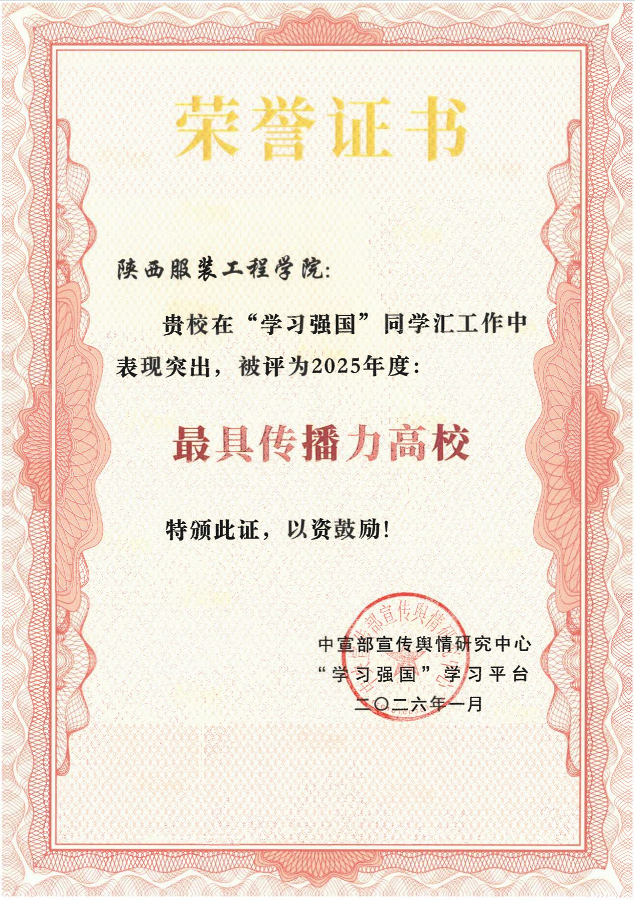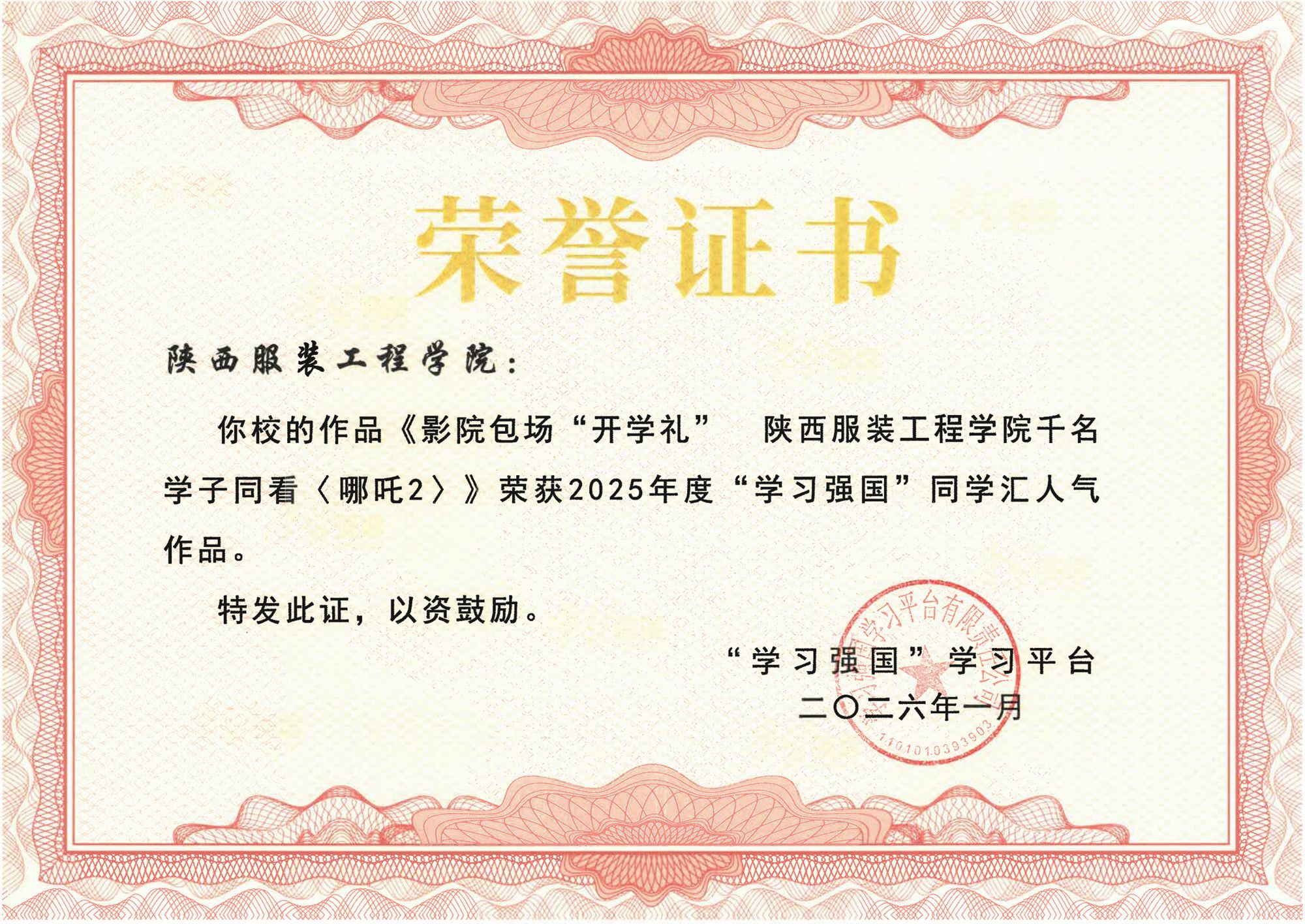 陕服新闻网讯(李文斌)近日,中宣部宣传舆情研究中心、“学习强国”学习平台正式公布2025年度“学习强国”同学汇表彰结果。我校凭借在网络思政建设与内容传播领域的卓越表现及广泛影响力,一举获得两项荣誉:学校荣获“2025年度最具传播力高校”称号,网络思政作品《影院包场“开学礼”陕西服装工程学院千名学子同看〈哪吒2〉》获评“2025年度人气作品”。此次获奖充分彰显了学校在新时代思想政治教育与校园文化网络传播工作中的创新活力与显著成效。