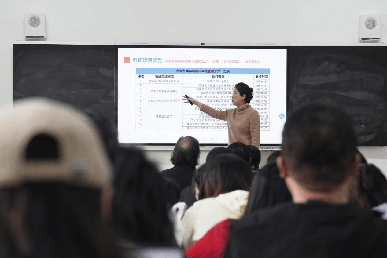 讲座中,刘晨晨系统介绍了国家、省级科研项目的审核标准与全过程筛选机制,强调教育厅、文旅部及国家三大基金在项目筛选中的高标准与严要求。他特别指出,艺术院校教师应重视创作类项目,如国家美展与重大题材创作,并呼吁教师们在理论研究的同时积极进行艺术创作,借力国家文化政策,提升学术影响力与社会服务能力。