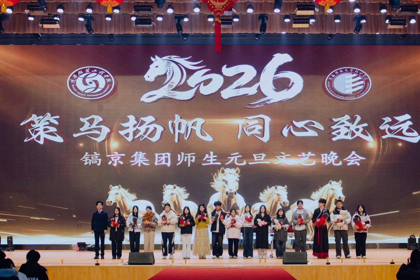 气势恢宏的开场舞《追梦圆舞曲》瞬间点燃全场热情。整场晚会以“同心奋进”为主线,分为“骏马踏春启新程”“骐骥逐梦展风华”“策马建功向未来”三大篇章。晚会通过形式多样、内容丰富的文化艺术节目,礼赞新时代、欢歌新征程,全方位展现镐京文化底蕴与发展活力,为广大师生共同迎接充满希望的2026年营造了浓厚的元旦新春文化氛围。
